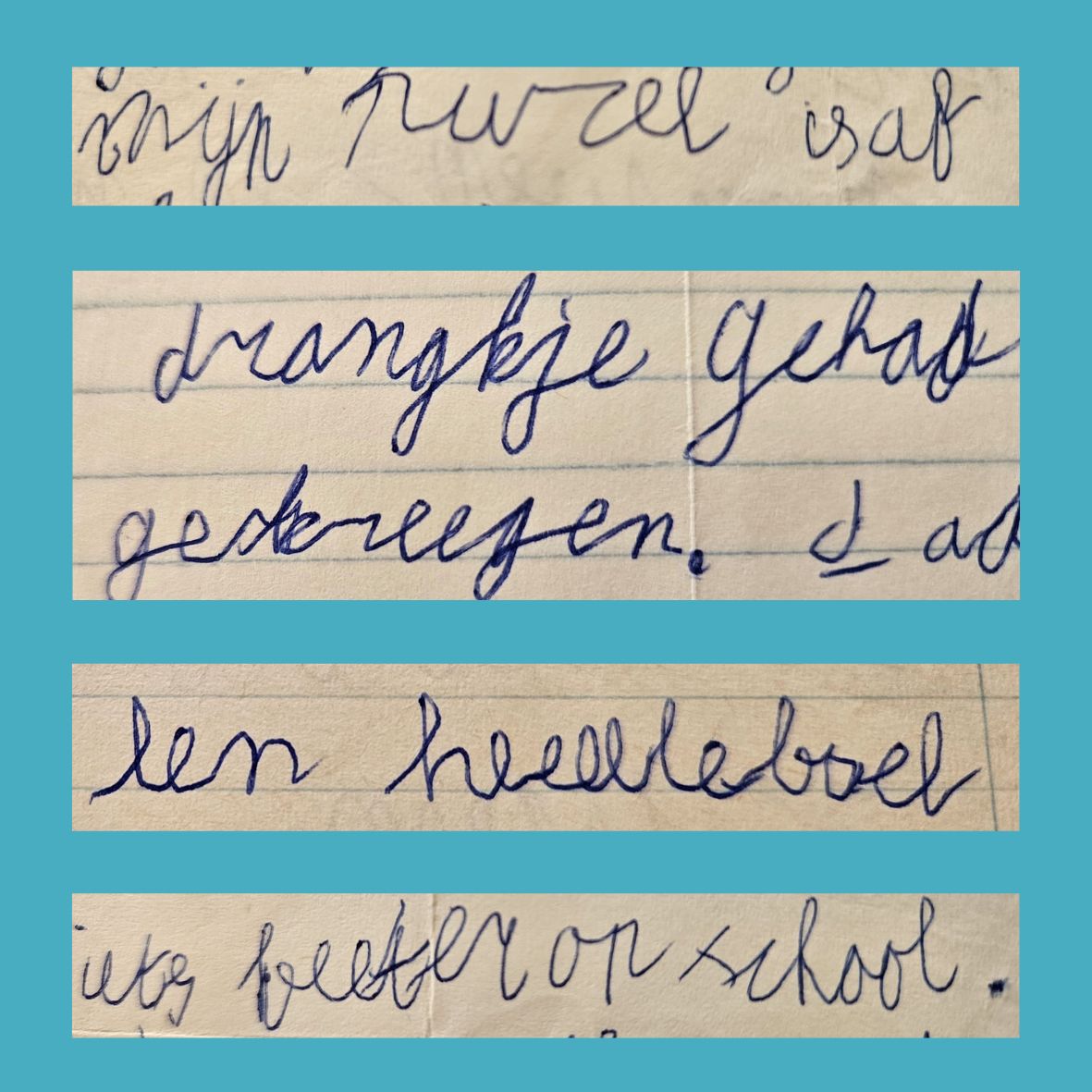 Als kleuter stond ik te trappelen om naar school te gaan. Alles, echt alles! vond ik leuk. En ik heb de mooiste herinneringen aan mijn lieve juf Henne! Toen ik naar de ‘grote school’ mocht, was ik helemaal supertrots. Ook deze juf was mijn veilige basis. Ze leerde me lezen, schrijven en rekenen, en ik was niet te stoppen: Ik wilde alles leren en nóg beter worden. Zelfs mijn handschrift wilde ik tot in de puntjes perfectioneren. Na wat aandringen kreeg ik een oefenboekje mee naar huis. In één avond schreef ik het helemaal vol. Resultaat? Geen mooier handschrift, wel zere vingers en een knoop in mijn maag.